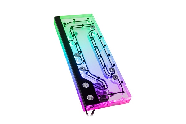 Since this has an integrated pump, it also acts as a handy reservoir/pump combo. The pump being used here is a DDC 3.1 PWM pump, which can push up to 500L of coolant per hour, with a maximum RPM of 3600. Beyond that, the distro-plate is kept looking stylish thanks to 18 addressable RGB LEDs, which you can customise to your liking.