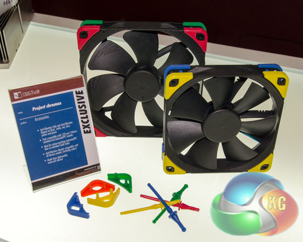 Another new reveal Noctua had in store this year is something called Project Chromax, which are essentially coloured rubber corner pieces to help Noctua's fans fit in with other colour themed builds. There are a few photos of prototypes that are interesting, purely so you can see how the hardware looks during development, and an oddity in a spacer frame that moves the fan by a fraction of a millimetre and reduces temperatures by 0.3 degrees.