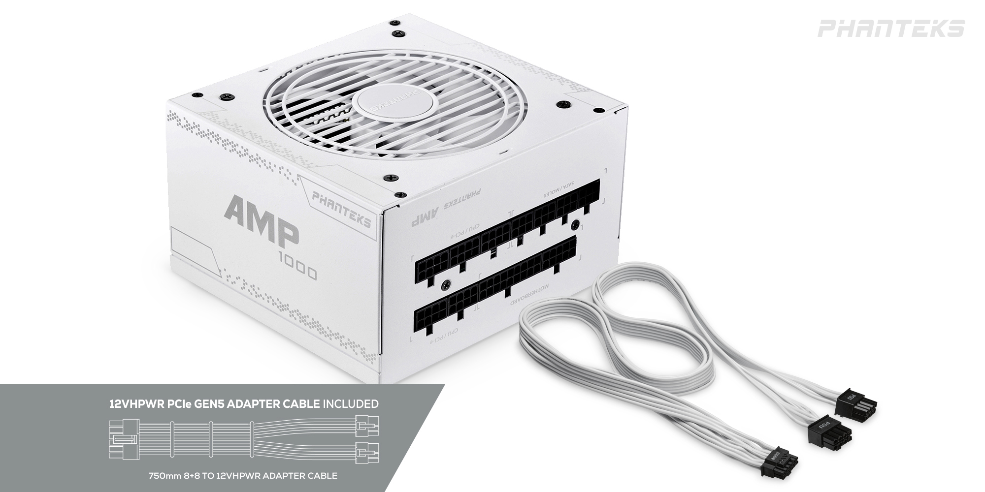 We'll start off with the power supplies. The Phanteks Revolt SFX 850W is an ATX 3.0 power supply built with the Intel SFX12V 4.0 platform in mind. It natively supports PCIe 5.0 12VHPWR and is rated with 80Plus Platinum efficiency, guaranteeing stable power to all of your components. Phanteks is also launching the new AMP 1000W V2 PSU, which also supports 12VHPWR, PCIe 5.0 and ATX 3.0, with 80Plus Gold certification. The AMP 1000W V2 will be available in both black and white, so you can pick whichever best suits your build.