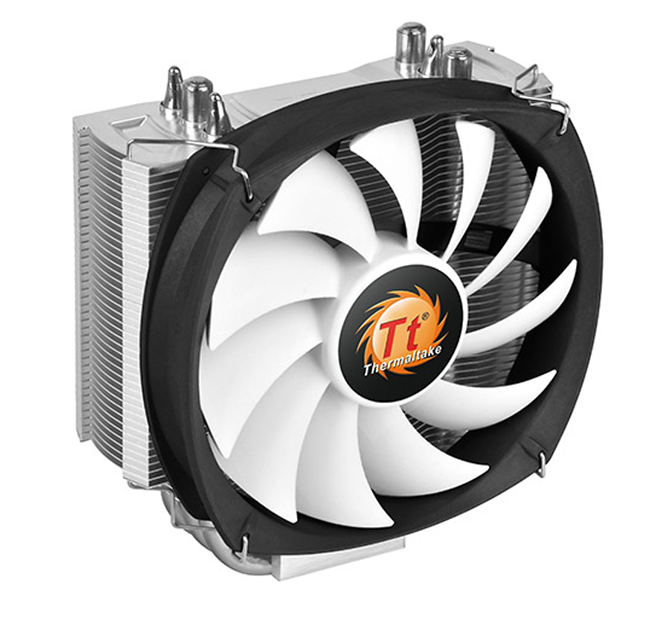 The Thermaltake Frio 14 happens to be very slim, the heatsink receives airflow from a 140mm pressure optimised fan and has three U-shaped heatpipes running through it, making direct contact with the CPU to draw heat away as fast as possible.