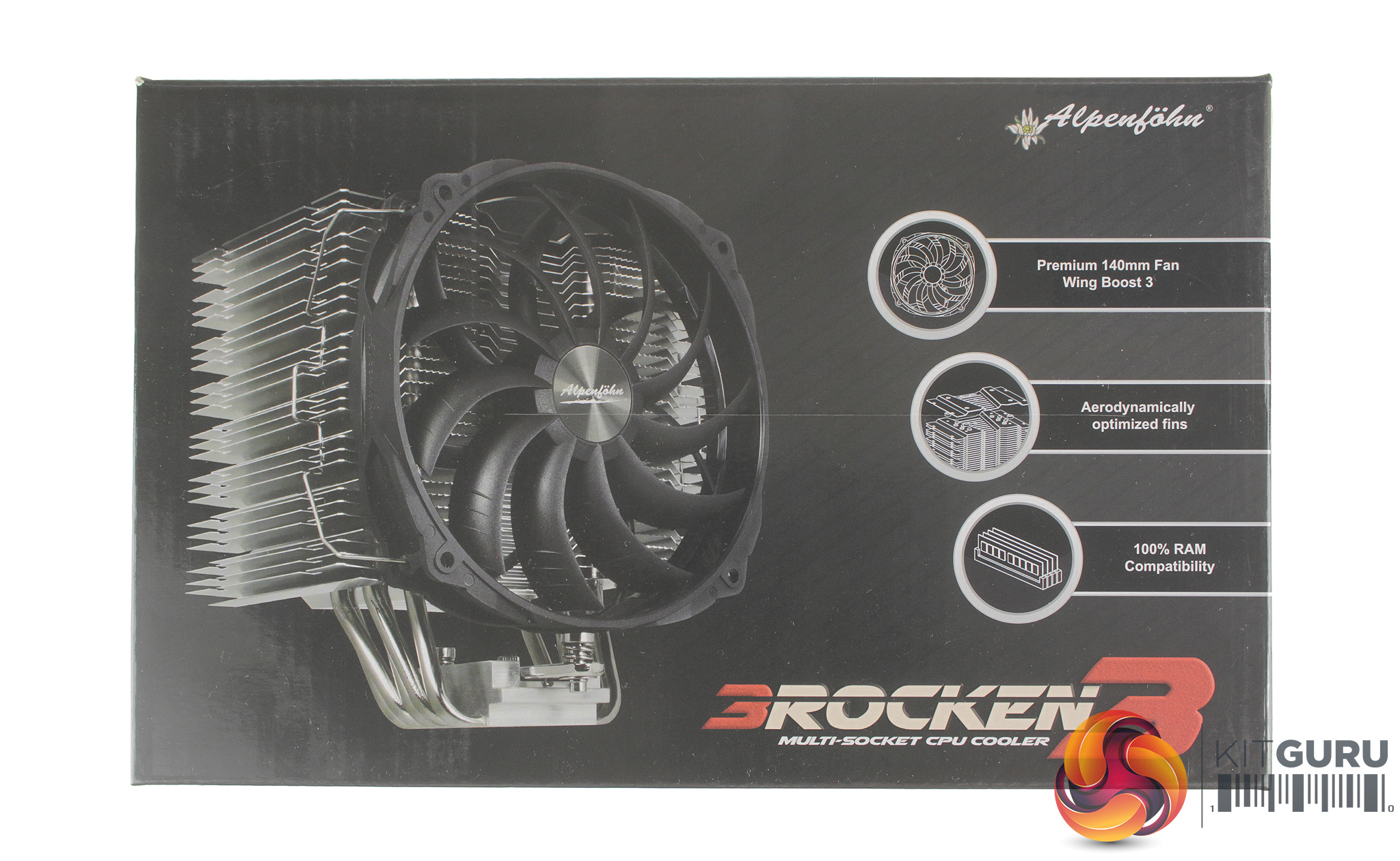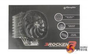 The Brocken 3 ships in a black box, with the front featuring a large image of the cooler and some key details such as fan information, and the 100% RAM clearance compatibility. The rear of the box provides much more detailed specs, socket compatibility, and information for the included Wing Boost 3 140mm fan.