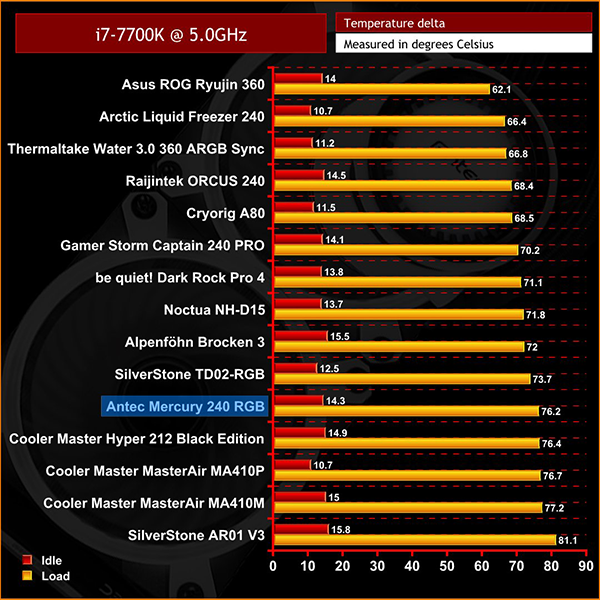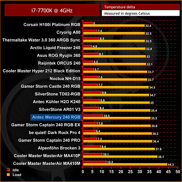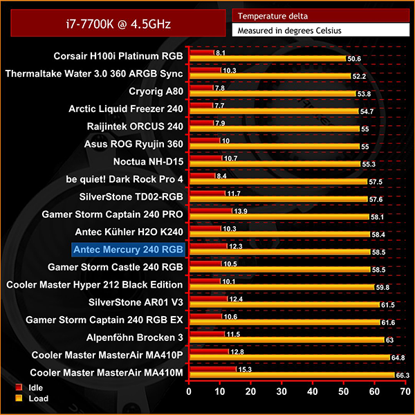 Moving onto our 4.5GHz testing, the results here are pretty similar to what we saw at 4GHz – the Mercury RGB 240 sits between the Captain 240 EX and Antec's own Kuhler H20 K240.