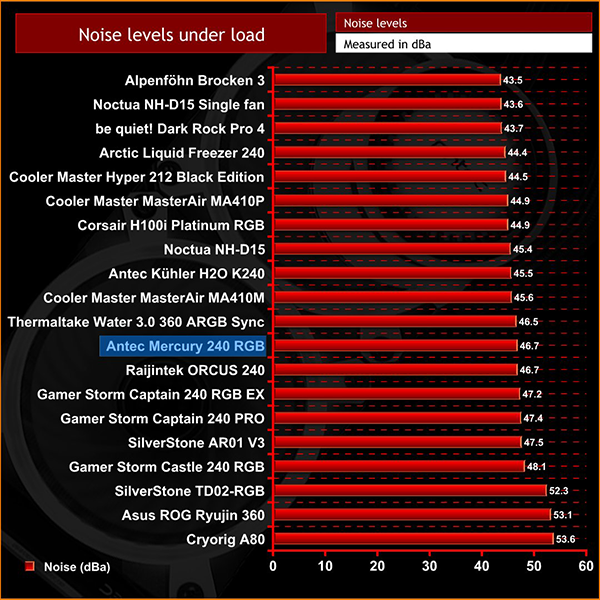 Noise levels under full load were only a bit louder than the Antec Kuhler H20 K240, which does feature the same fan design. The audible noise was noticeable from around 5 to 6 feet away, but was not particularly irritating.