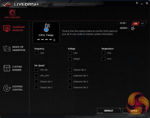 Options for the OLED screen are also pretty extensive. Hardware monitoring works really well, for instance, as you can set the screen to display a number of core system details, like CPU frequency, voltage, and temperature as well as individual fan speeds.