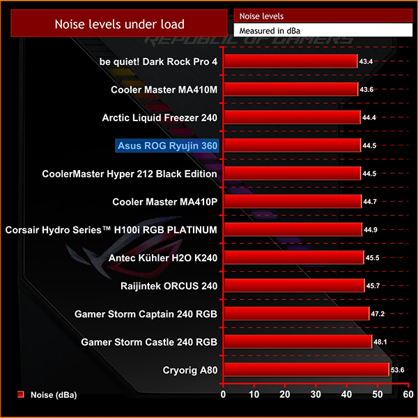 The Ryujin 360 came in at 44.5 dBA with our i7 7700K overclocked and under full load, which is only surpassed by the Arctic Liquid Freezer 240, and larger air coolers. This is actually really impressive considering the higher number of fans, not only the three mounted to the radiator, but also the smaller 60mm CPU block fan. Basically, the Ryujin 360 is still providing great cooling performance, without the cost of high noise levels.
