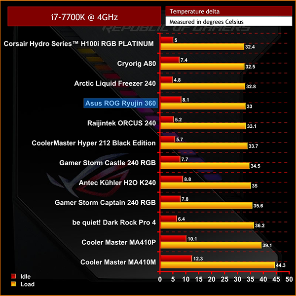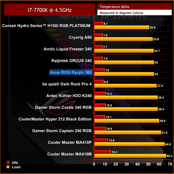 With our i7 7700k locked in at 4GHz, the Ryujin 360 performed pretty admirably, coming in 4th from the top – but with a very minimal difference between 4th and 1st place, this is still really impressive. At 8.1 degrees at idle it is a little warmer than some competitors, but again only a minor difference of 3 or so degrees compared to our best in test, the Corsair Hydro Series H100i RGB Platinum.