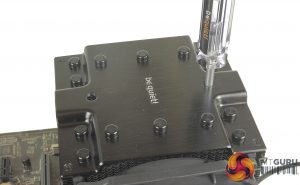 There are two small caps which need to be unscrewed from the top of the cooler, to allow the included screwdriver to pass through the centre of the cooler. The thermal compound can then be applied to the CPU die, and the included mounting bridge passed through the centre of the cooler, overtop the coolers CPU block.