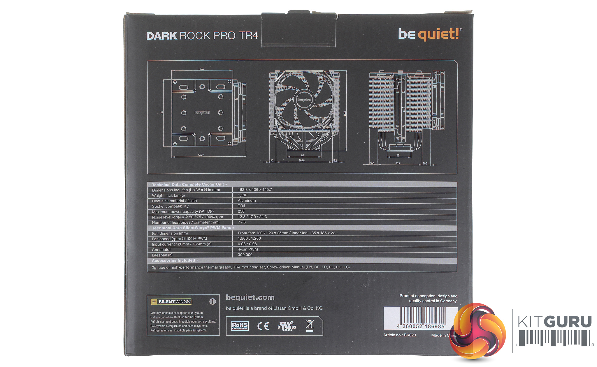 Just as with The Dark Rock Pro 4, the TR4 version is rated for CPUs with up to a 250W TDP, and the rear of the box provides a more detailed set of dimensions for the cooler, which should help to ensure case compatibility.