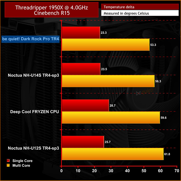 With Cinebench we ran a number of passes of the multi-core test until temperatures stabilised. Max temperatures when overclocked did come in a little lower at 53.3 degrees. We also ran some single core passes, just see how the Dark Rock Pro TR4 would fare when the processor is not utilising all 32 threads, and we saw the 1950X top out at 23.3 degrees. Locked in at 3.4GHz we find lower temperatures still both for single and multi-core tests.