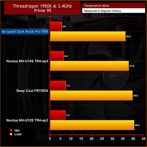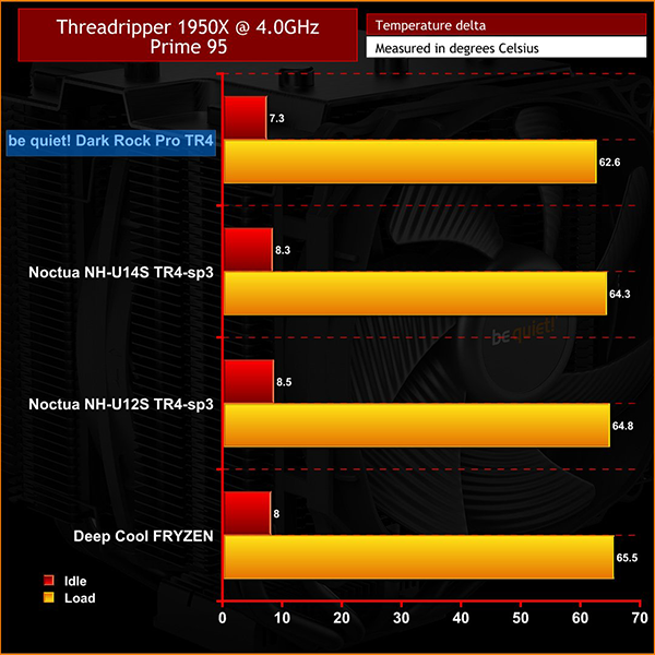Taking a look at Prime 95 first, at 3.4GHz the Dark Rock Pro TR4 performed pretty admirably – maxing out at 36.2 degrees and idling at 5.6. Even when overclocking to 4.0GHz, the absolute highest temperature recorded came in at 62.6 degrees, while our 1950X sat quite happy idling at 7.3 degrees.
