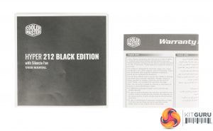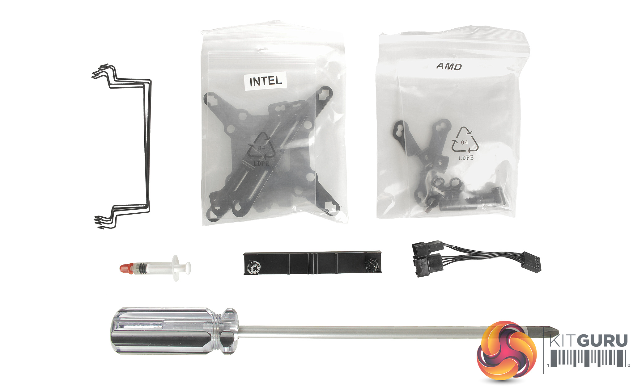 And in the box we find the cooler itself, with the included 120mm fan attached, an accessories pack with mounting hardware for all current Intel and AMD mounts. A warranty and instruction manual are also included as well as two really cool additions, an extra set of mounts if you wanted a push-pull configuration, and a 4 pin PWM splitter cable.