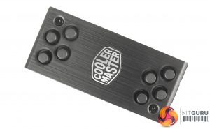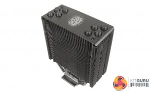 Alongside the cleaner black nickel coating, the top of the cooler also sports a really good looking top cover which is made from brushed aluminum, with a matching gunmetal black finish. The tops of the heat pipes are all capped as well, and there is a nice and shiny cooler master logo. Overall very clean indeed.