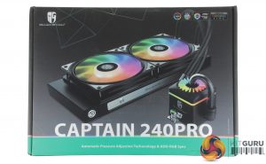 Taking a look at the cooler's box, it features a similar colour scheme to most Deepcool coolers. The front features a large image of the Captain 240 PRO and information on its addressable RGB lighting. The Captain 240 PRO is specified to work with ASUS Aura Sync, GIGABYTE RGB Fusion, MSI Mystic Light Sync, and ASRock Polychrome software.