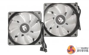 The two 4 pin PWM 120mm RGB fans included with the castle 240 which have a wider, static pressure optimised blade design which suits the radiator application, and small rubber isolation pads are present around all of the mounting spots which should help a little with vibration dampening.