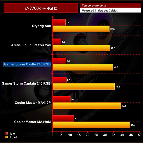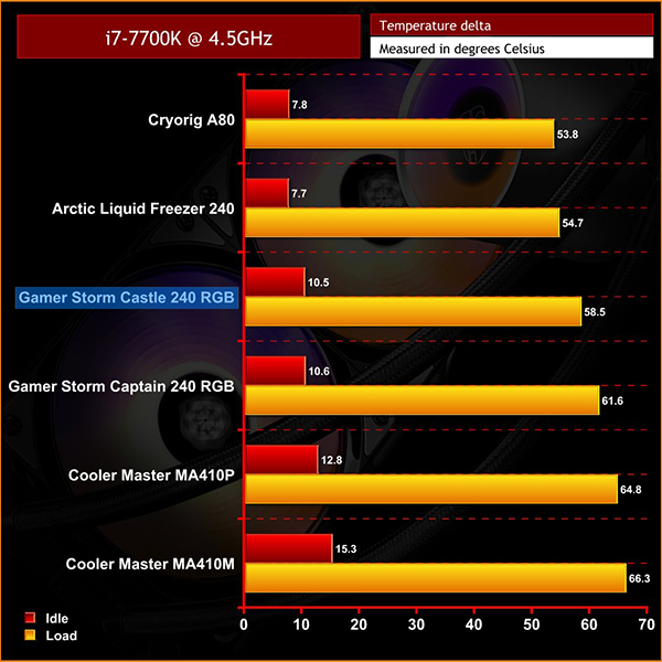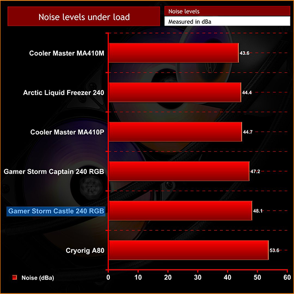 Testing results look pretty good with the Castle 240 RGB sitting above the Gamer Storm Captain 240 RGB EX, but just below the Arctic Liquid Freezer 240 and the Cryorig A80 which is unsurprising as the A80 has a slightly larger 280mm radiator.