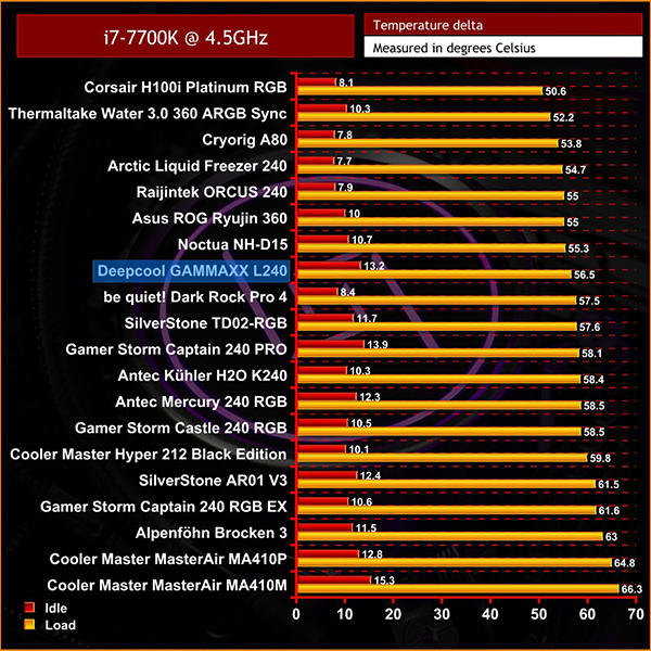 At 4.5GHz, the L240's fans basically ramped all the way up to full speed and stayed there, making it suddenly much more audible. This did lead to some more impressive temperatures, though, and sees the GAMMAXX L240 actually overtake the TD02-RGB.