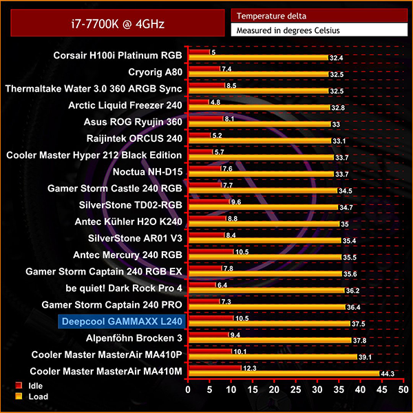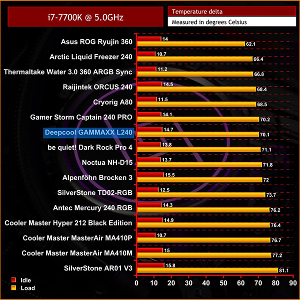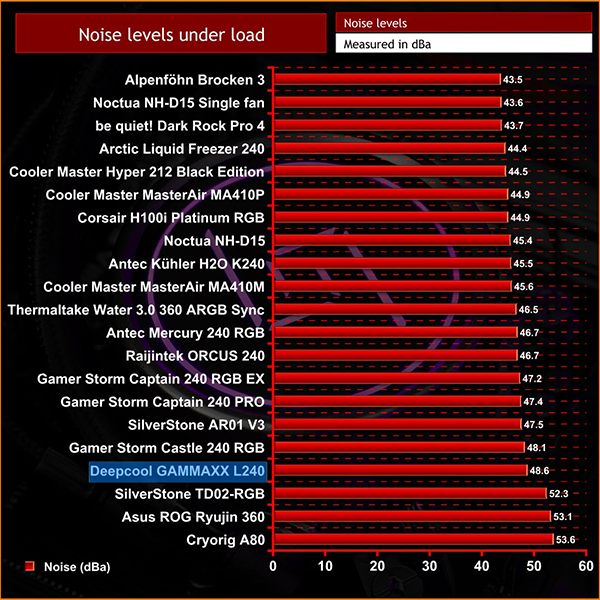 With our 5GHz testing, there wasn’t any real audible difference in fan noise moving up from 4.5GHz, with the fans spinning at essentially the same speed. Even at this higher overclock, the GAMMAXX L240 still sat in a similar position, just above the TD02-RGB.