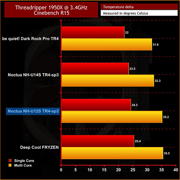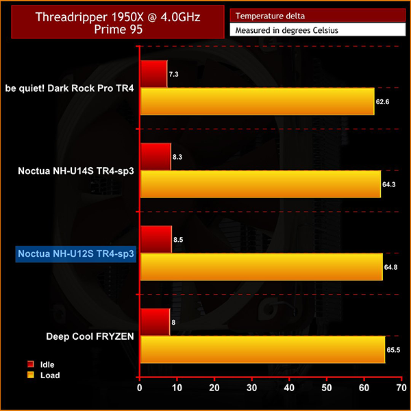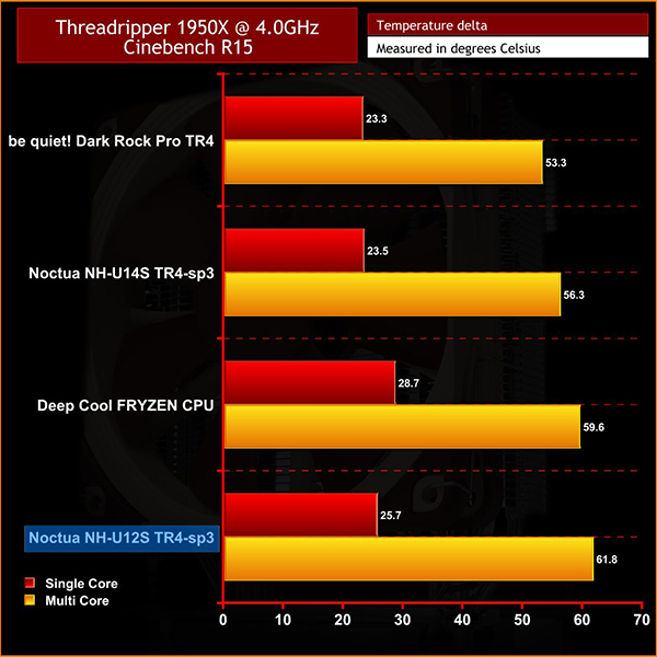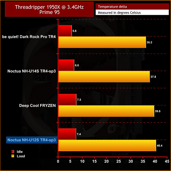 With our 1950X overclocked to 4.0GHz on all cores, temperatures for a single 120mm air cooler look really good at just under 65 degrees at full load, and idling at 8.5 degrees. At stock clocks, the NH-U12S TR4 kept the maximum temperature to 40.4 degrees, with a slightly lower idle figure of 7.4C.