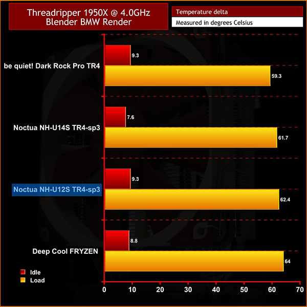 Our Blender BMW benchmark testing is a bit more of a real-world scenario for the 1950X, and the NH-U12S TR4 still performs well with a peak figure of 62.4 degrees when overclocked, and 39.4C with the CPU at 3.4GHz.