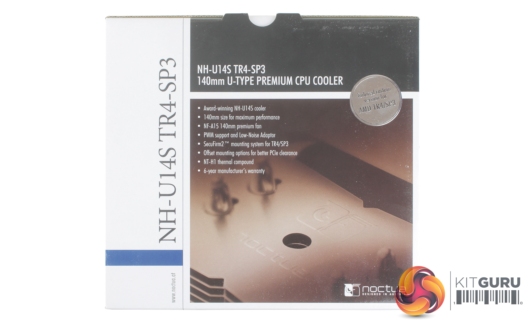 The NH-U14S TR4-SP3's packaging follows Noctua's typical design, a large closeup of the cooler inside, and some key features are listed. Opening everything up reveals the cooler itself, along with a pretty simple accessories box.