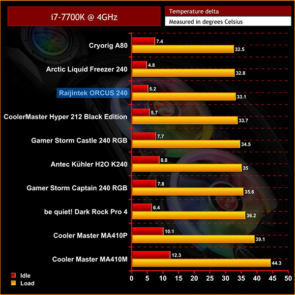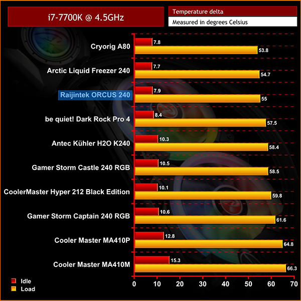 Looking across the testing results the Orcus 240 is pretty impressive. Firstly at stock, the Orcus 240 outpaces almost everything coming in third just behind the Arctic Liquid Freezer 240 and the Cryorig A80. And only by a degree or so. At both load and idle temps are really impressive and this carries through to our 4.5GHz overclock