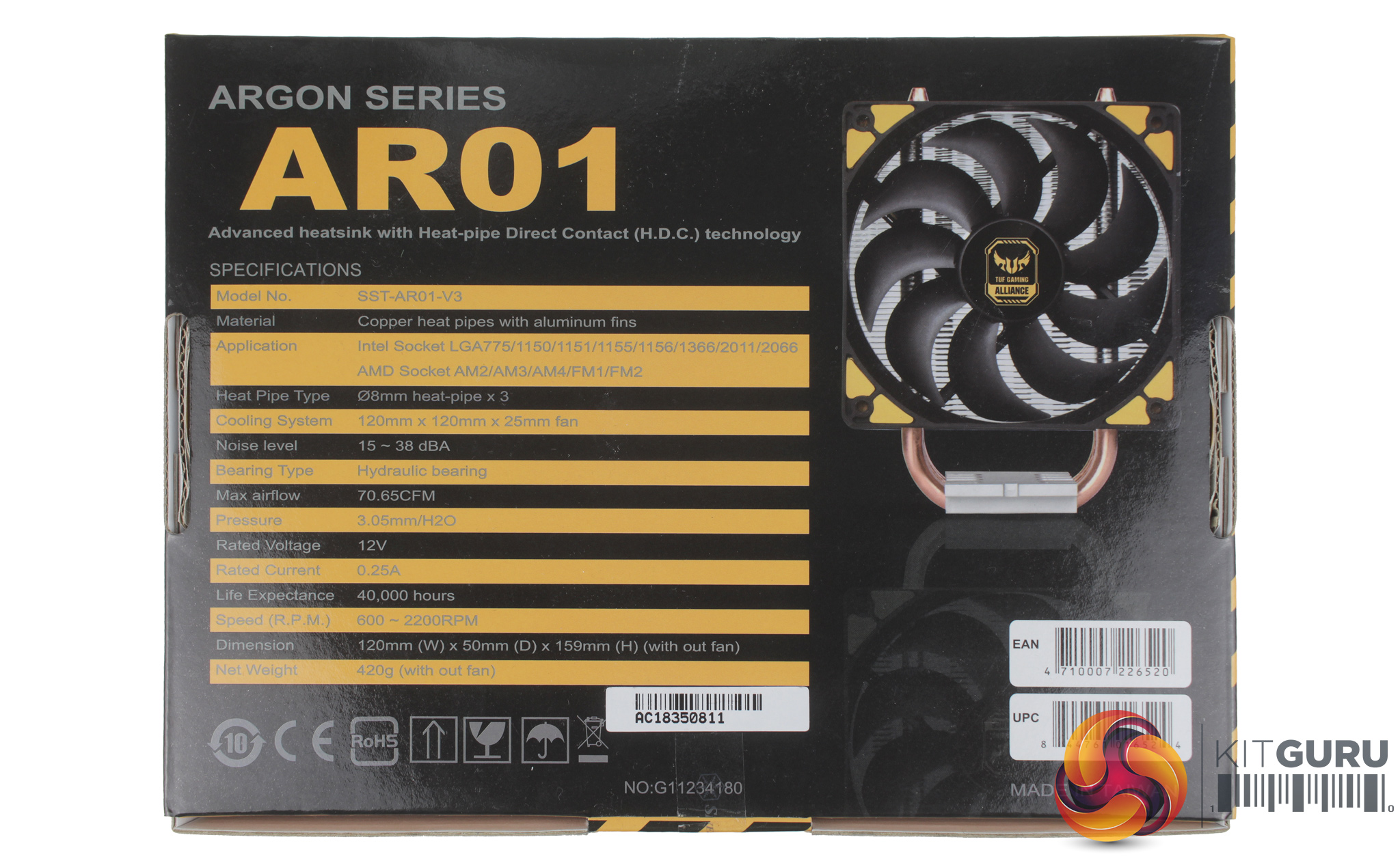As the AR01 V3 is the third iteration of the AR01 cooler, you would expect there to be some improvements over past designs, and you would be correct. Although the heatsink shares the same aluminium fan design and three copper heat pipes as the V3's predecessor, the new updated TUF style fan varies with its RPM range, as it is rated at 600 – 2200 RPM vs the previous AR01 V2’s 1500 – 2500RPM. In theory, this should make for a quieter cooler, but this is something we will have to check during testing.