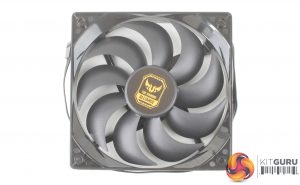 The cooler itself looks and feels pretty solid with a diamond cut aluminium top plate, which fits in really well with the TUF industrial design. It's a pretty good looking piece of kit, and shouldn’t cause any compatibility issues with cooler dimensions (without the fan) coming in at 120mm (W) x 159mm (H) x 50mm – so pretty standard for a 120mm fan cooler.