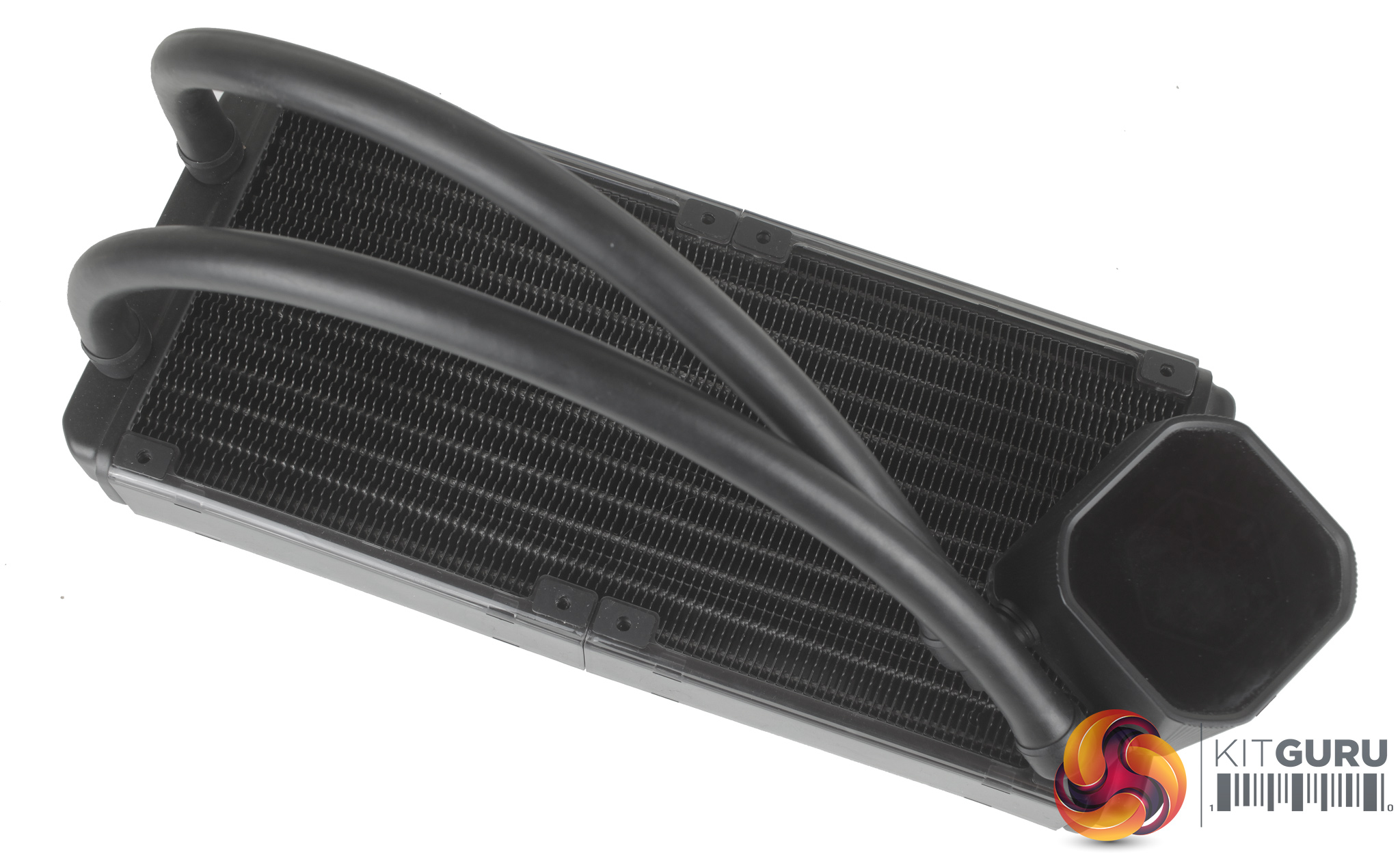The cooler features a pretty standard 240mm radiator but interestingly with plastic covers clipped over both sides. These covers have a carbon fibre type pattern to them, and further pads to help with reducing fan vibration.