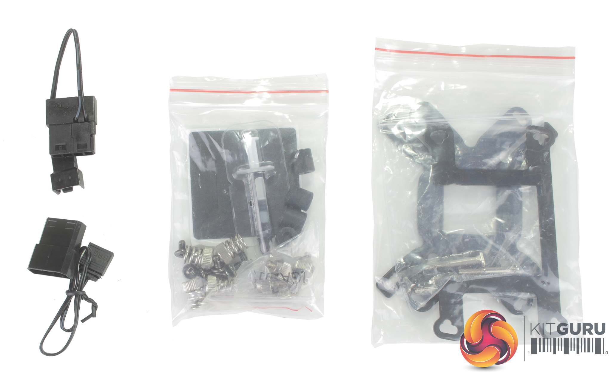 Opening up the box we find a number of pieces of mounting hardware for current AMD and Intel mounts, two 4-pin PWM 120mm fans both with RGB lighting, and then the cooler itself. In terms of accessories, outside of the mounting hardware, you do receive a couple of 4-pin Molex adapters – one to power the LEDs if you are not using a motherboard header, and a second for powering the fans.