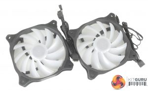 The included fans feel nice and solid, and feature anti-vibration grommets in each corner. Both fans also have two cables running from them, one for the RGB LEDs, and the second a 4-pin PWM connector. It is nice to see that the 4-pin RGB connections are not proprietary which is the case with some coolers, while both fans and the CPU block have two connectors a piece, which allows you to daisy chain them all together.