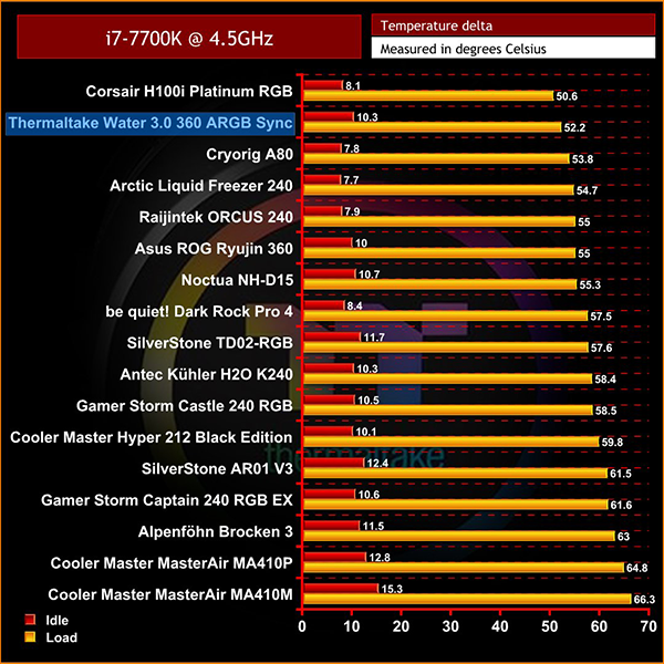 At 4.5GHz, we still see great performance from the cooler, with it only being outpaced by the H100i Platinum RGB from Corsair. Impressively, the Water 3.0 is still outperforming its closest competitor, the Ryujin 360, by a couple of degrees.