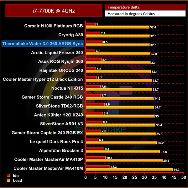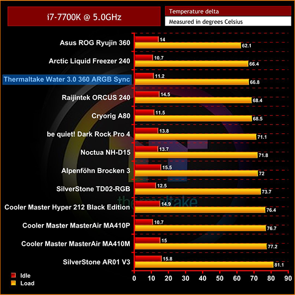At 5GHz, little changes although the Water 3.0 360 ARGB does move into 3rd place, dropping behind the Ryujin 360 for the first time.