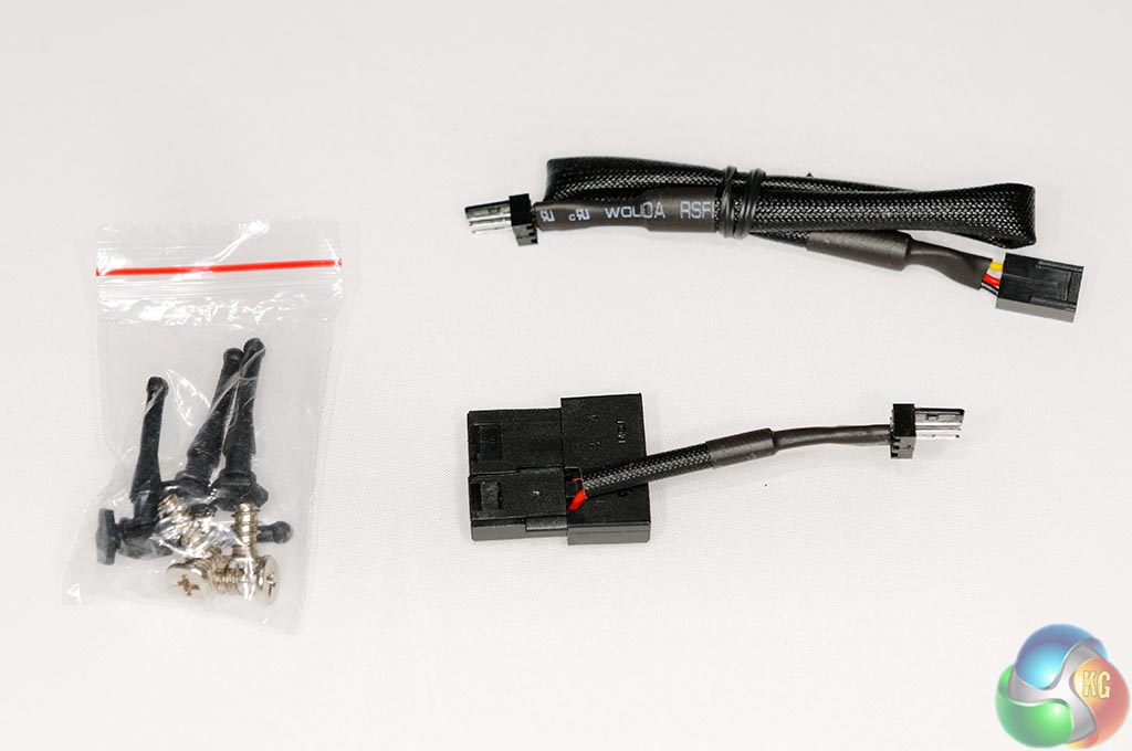Inside the packet is a 3 pin to 4 pin adapter, a 7V voltage reduction 3 pin adapter, 4 screws and 4 rubber rivots.