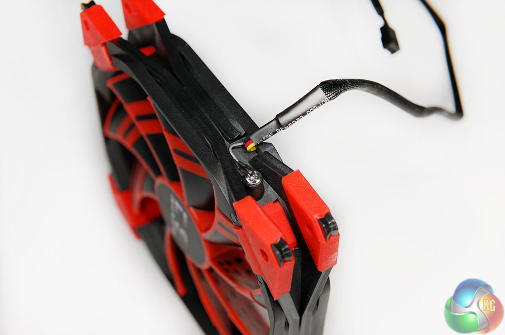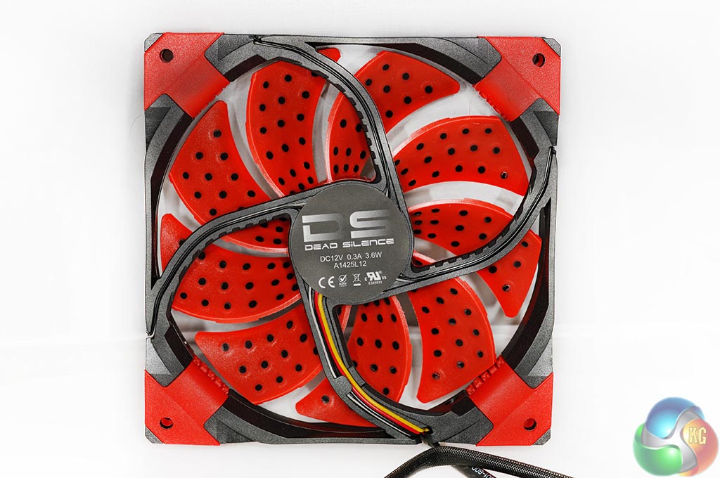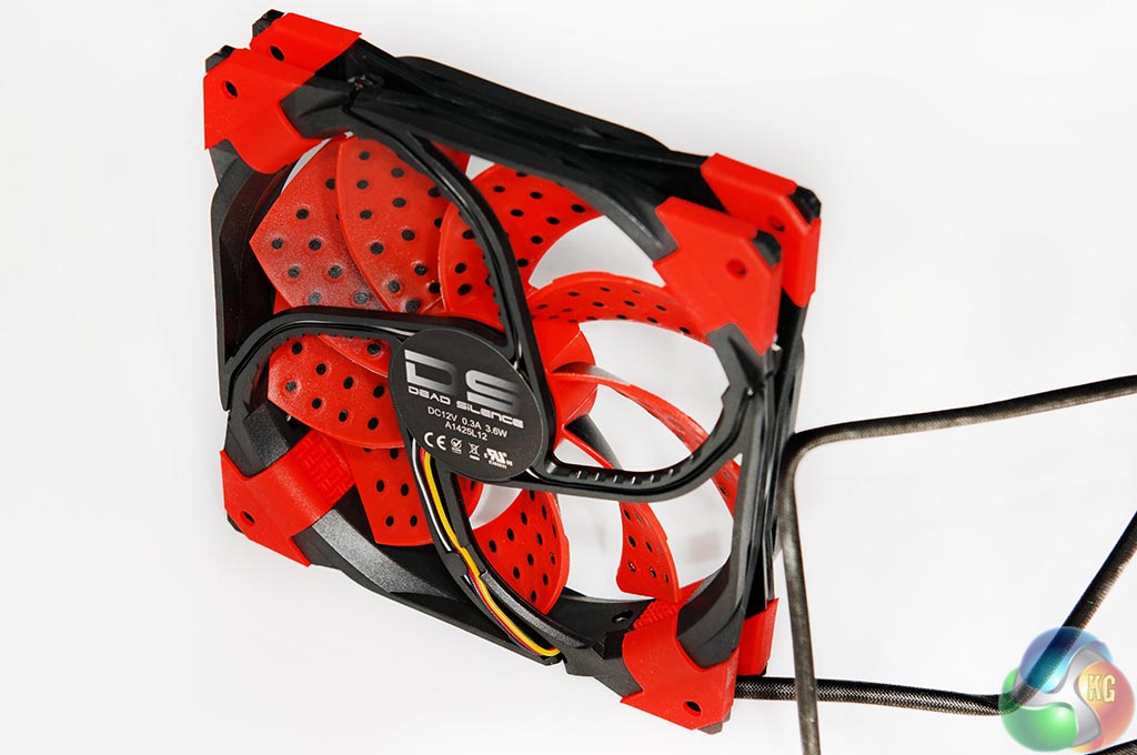 The Aerocool DS Dead Silence 140mm fan in operation, above. Each corner of the unit is lit up by a single Red, matching LED.