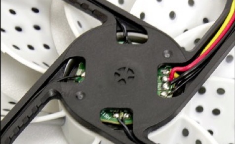 This Fluid Dynamic Bearing (FDB) fan is rated at 12V, with a starting voltage of >3.0 V. It is rated to demand 2.4 watts of power (same as the 120mm version on the previous page). The voltage reduction cable is included, which steps down the demand to 7V. The rear side of the fan blades incorporates a ‘fish eye' design to help reduce turbulence, lowering noise levels.