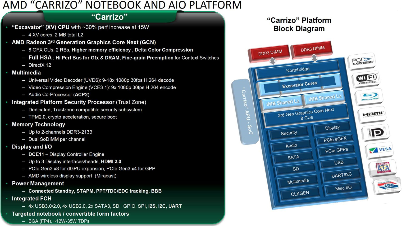 AMD Fusion “Carrizo” accelerated processing unit will feature two dual-core AMD “Excavator” (XV) modules with 2MB L2 cache (1MB of cache per module, 512KB of L2 cache per core), AMD Radeon graphics based on the third-generation graphics core next architecture (GCN 3.0) architecture with eight compute units (512 stream processors in total), an integrated dual-channel DDR3 memory controller, a new special high-performance bus to connect x86 cores to graphics cores and DRAM, further HSA [heterogeneous system architecture] enhancements, PCI Express 3.0 controller as well as all-new multimedia and input/output engines.