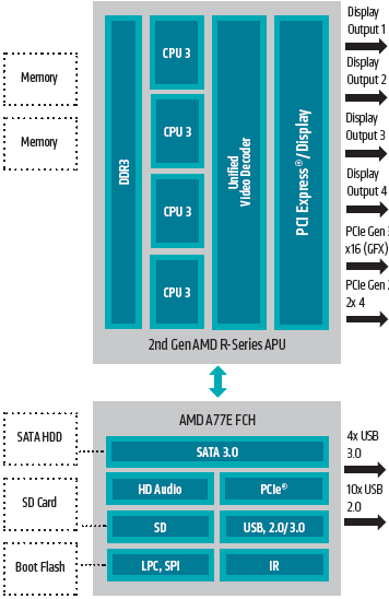The fresh family of AMD RX-series chips with HSA capabilities consist of five models. The new processing units feature one or two dual-core Steamroller modules (two or four cores in total), 1MB or 4MB level two cache (512KB or 1MB cache per x86 core), AMD Radeon graphics engine with three, six or eight GCN compute units (192/384/512 stream processors in total) operating at up to 686MHz, dual-channel DDR3 memory controller with hUMA [heterogeneous unified memory architecture] technology, up to 35W thermal design power and so on. The new RX-series chips are compatible with AMD A77E core-logic-set.