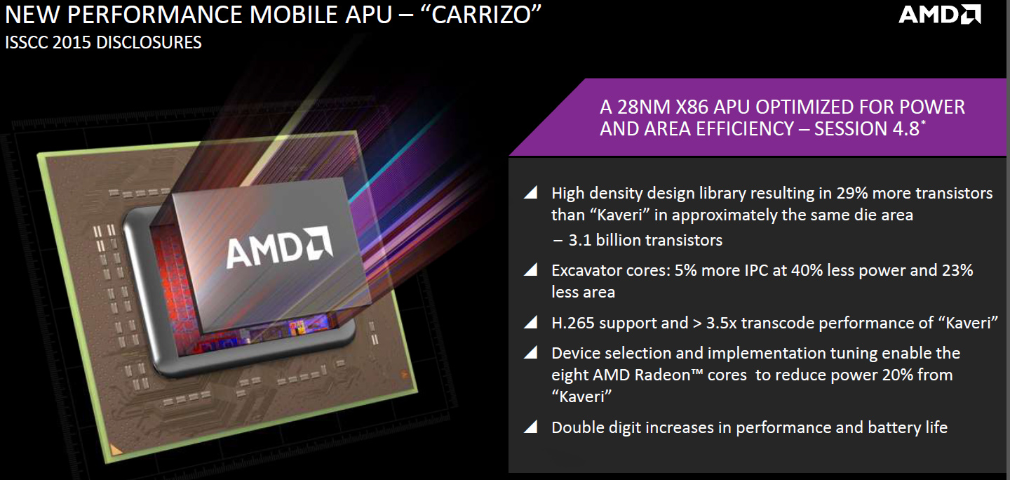 AMD’s code-named “Carrizo” APU was developed from the ground up for ultra-thin notebooks in mind. The chip was designed using high-density libraries of elements and AMD engineers used a number of tricks to reduce leakage and cut-down power consumption. The chip is also made using a 28nm process technology optimized for minimum power consumption. In addition, “Carrizo” incorporates voltage adaptive operation, or, adaptive voltage and frequency scaling (AVFS) technology, which adjusts frequency and voltages of different parts of the APU in real-time. Finally, “Carrizo” features a new S0i3 power state, which achieves the same power level as the S3 state (standby), but can be activated on the fly under the control of power management at sub-second time frames.