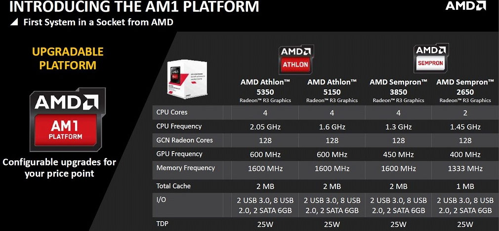 The new Athlon and Sempron accelerated processing units in AM1 form-factor based on Kabini design feature two or four AMD Jaguar x86 cores, AMD Radeon R3 graphics engines with GCN architecture and 128 stream processors, DDR3 memory controllers and so on. Like other Kabini-based platforms, the AM1 supports two Serial ATA-6Gb/s, two USB 3.0, eight USB 2.0, PCI Express 2.0 x4, DisplayPort, HDMI and D-Sub support.