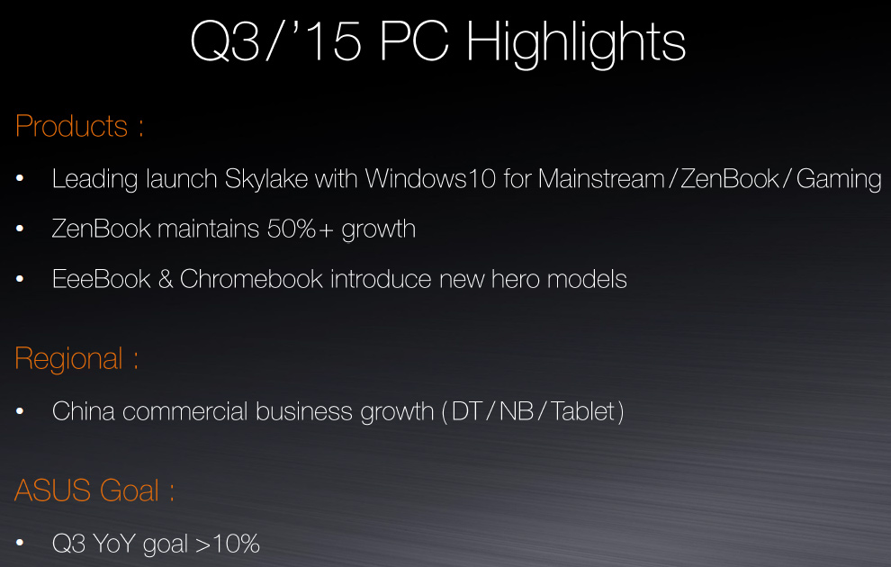 “With Skylake and Windows 10 scheduled to be launched in the third quarter, we are focusing on a couple of models in our mainstream product lines, for example, one from ZenBook, the other from gaming products,” said Jerry Shen, chief executive officer of Asustek Computer, at the company’s quarterly conference call with investors and financial analysts, according to a transcript published by SeekingAlpha. “We are going to launch ahead of our competitors.”