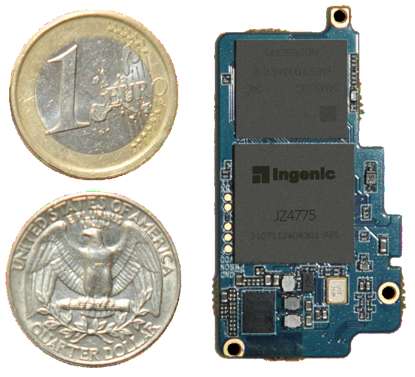 Ingenic Newton is a highly integrated chip that includes 1GHz MIPS-based Ingenic JZ4775 CPU with 256KB L2 cache; memory and storage controller that supports mobile DDR3/DDR2/LPDDR RAM as well as eMMC storage; 2D graphics engine, video processing engine (supports MPEG-2, MPEG-4, VC-1, H.264, VP8, RV9 codecs) with 720p@30fps playback, 3-axis gyroscope, accelerometer magnetometer, pressure, humidity and temperature sensors; Wi-Fi (802.11 a/b/g/n at 2.4/5 GHz), Bluetooth 4.0 + EDR (including Bluetooth LE support), NFC and FM connectivity. The SoC fully supports UART, I2C, USB and GPIO.