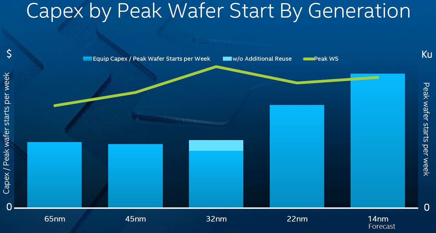 “We believe [that on] the 10nm [node] the capital per wafer start does go up, but it goes up less than the density does,” said Brian Krzanich, chief executive officer of Intel. He added that the company’s 10nm unit costs and per-transistor costs will offset increased capital requirements.
