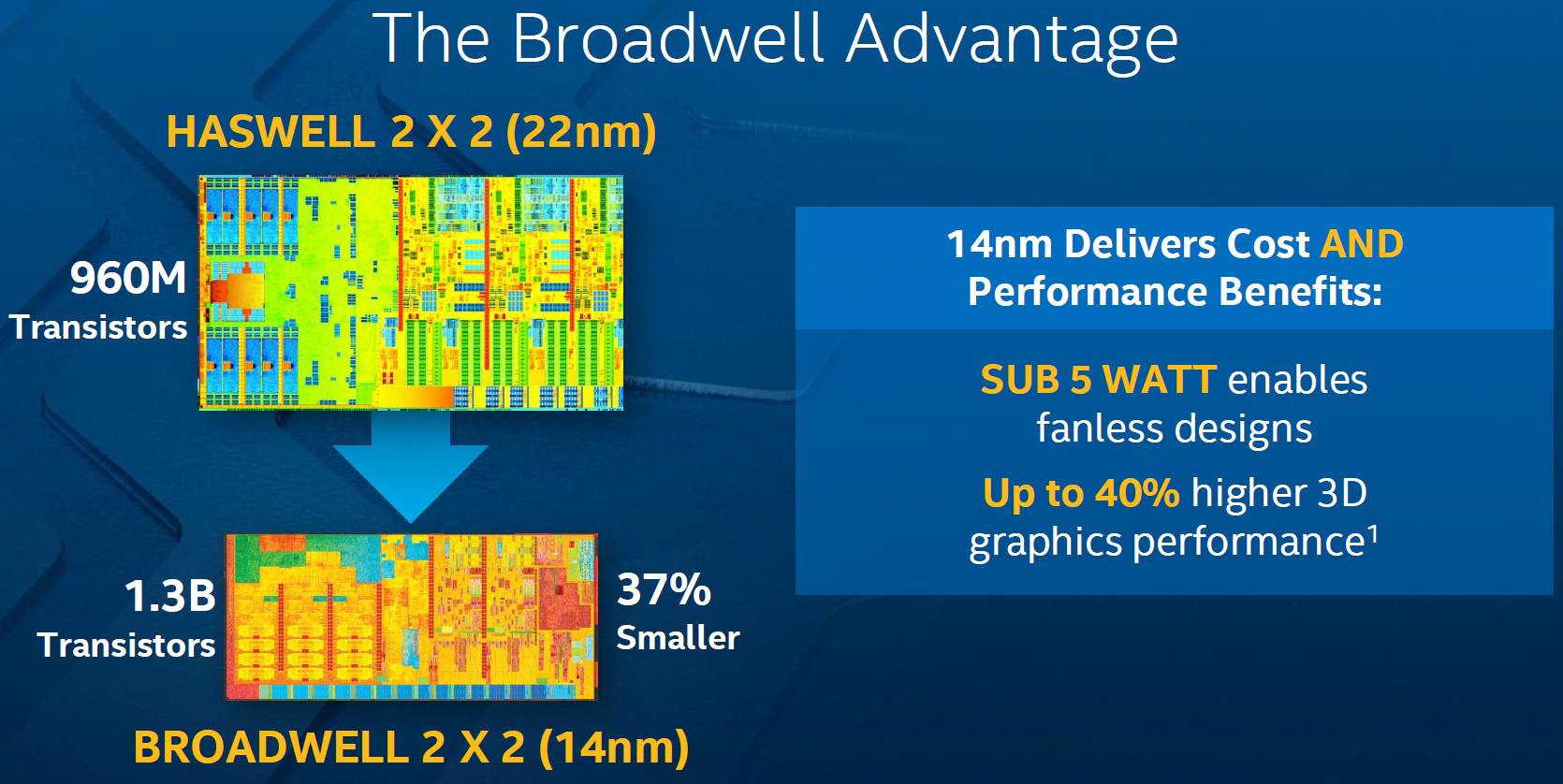 Increasing transistor density helps Intel to reduce die sizes of its chips without decreasing their performance or feature-set. For example, Intel's dual-core “Broadwell” processor is 37 per cent smaller than comparable “Haswell” chip, but its feature sizes are 33 per cent smaller, which is a good example how transistor density increases from generation to generation. As a result, increase of transistor density is a crucially important thing for the company in the future.