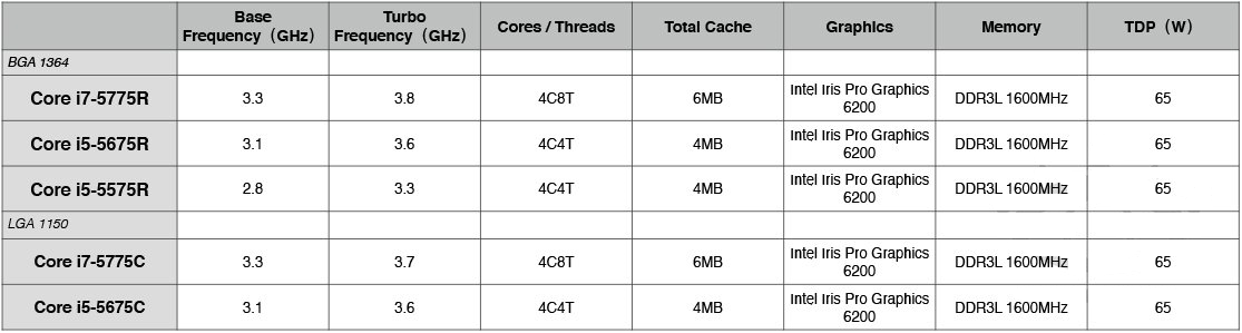 The new Core i7-5775C (4 cores/8 threads, 3.30GHz/3.80GHz base/turbo frequency, 6MB cache, Iris Pro 6200 graphics core, 65W TDP) and Core i5-5675C (4 cores/4 threads, 3.10GHz/3.60GHz base/turbo frequency, 4MB cache, Iris Pro 6200 graphics core, 65W TDP) will feature unlocked multiplier and will thus support overclocking. Unfortunately, these will be the only “Broadwell” processors for desktops in LGA packaging. Given their low clock-rates, it is obvious that they will not outperform Intel’s Core i7-4790K “Devil’s Canyon” and will even not beat the two years old Core i7-4770K “Haswell”.