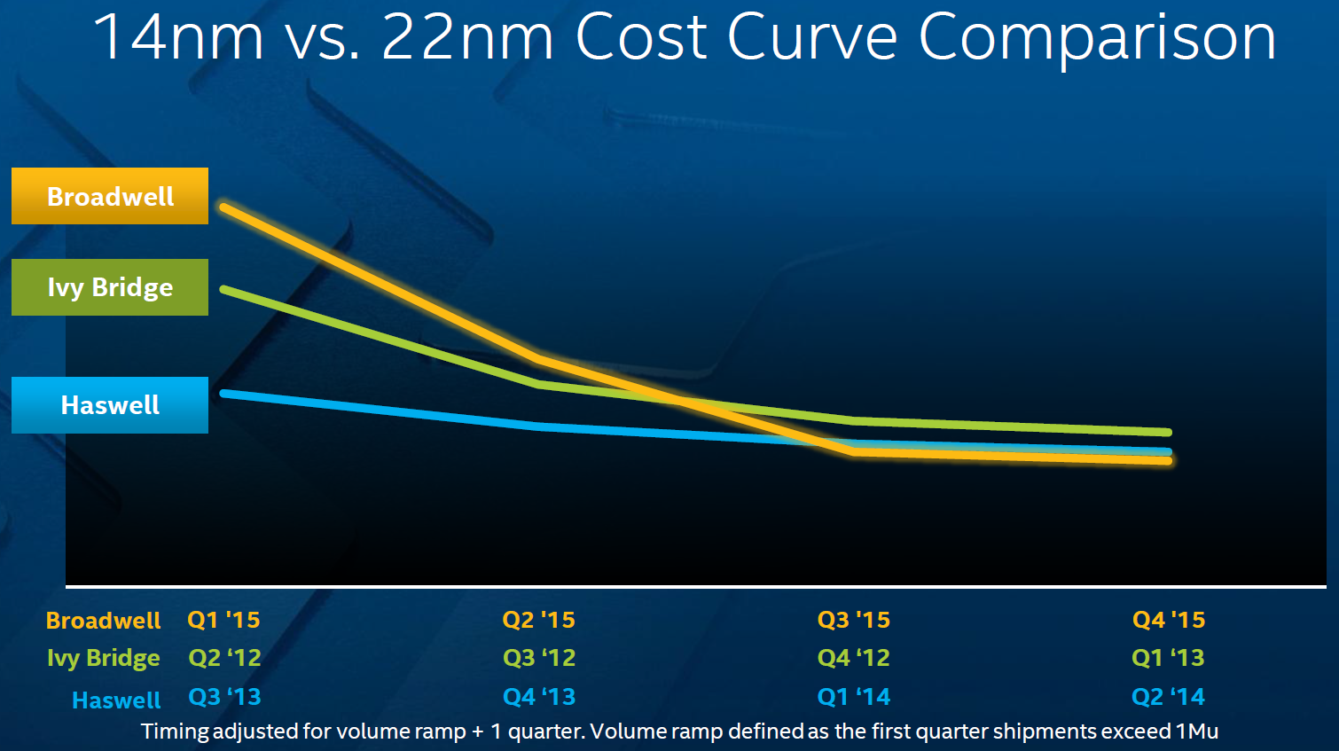 UPDATE: Adding Intel's 14nm vs 22nm cost curve comparison as well as a comment regarding current “Broadwell” costs.
