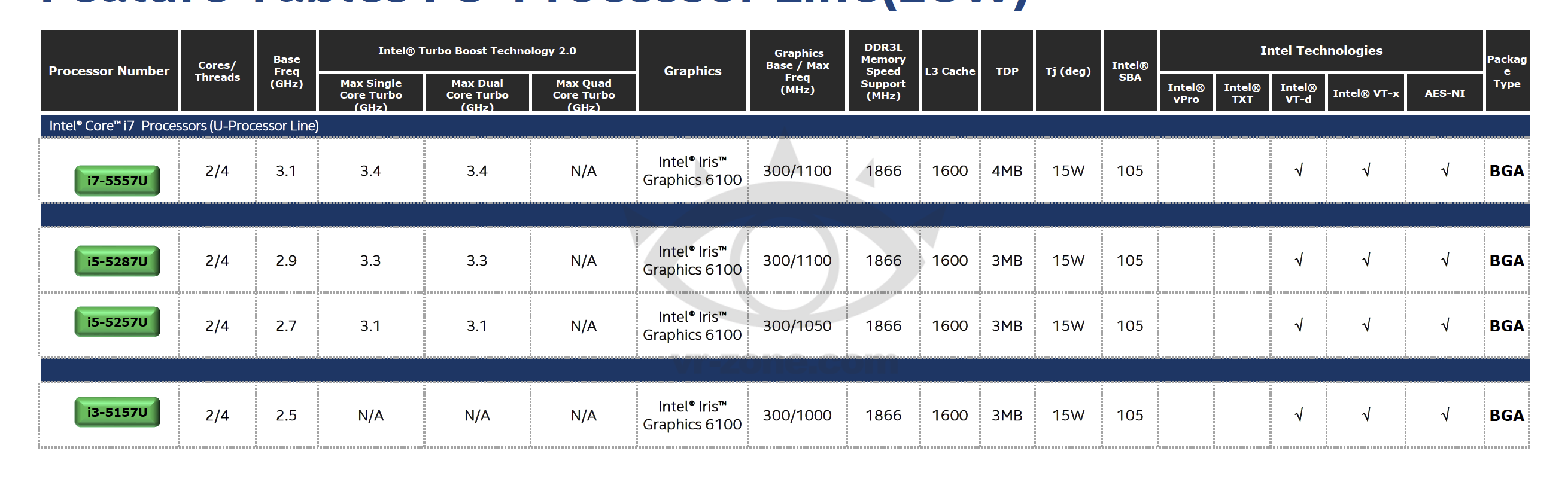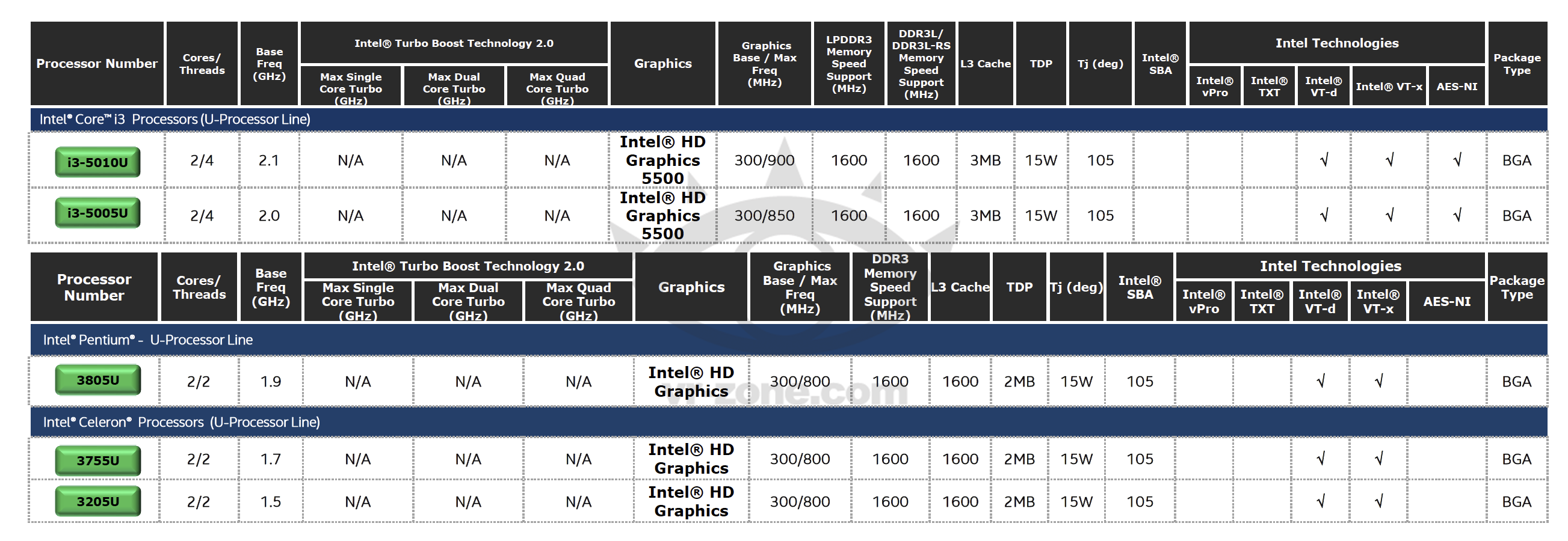 As reported, Broadwell-U (BDW-U) microprocessors feature two cores with HT, new-generation Intel graphics cores, 2MB, 3MB or 4MB of cache, dual-channel DDR3 DRAM controller as well as integrated core-logic. It is noteworthy that thermal design power of all Broadwell-U processors will be just 15W, which will allow makers of notebooks to offer very energy-efficient laptops even based on Celeron or Pentium processors.