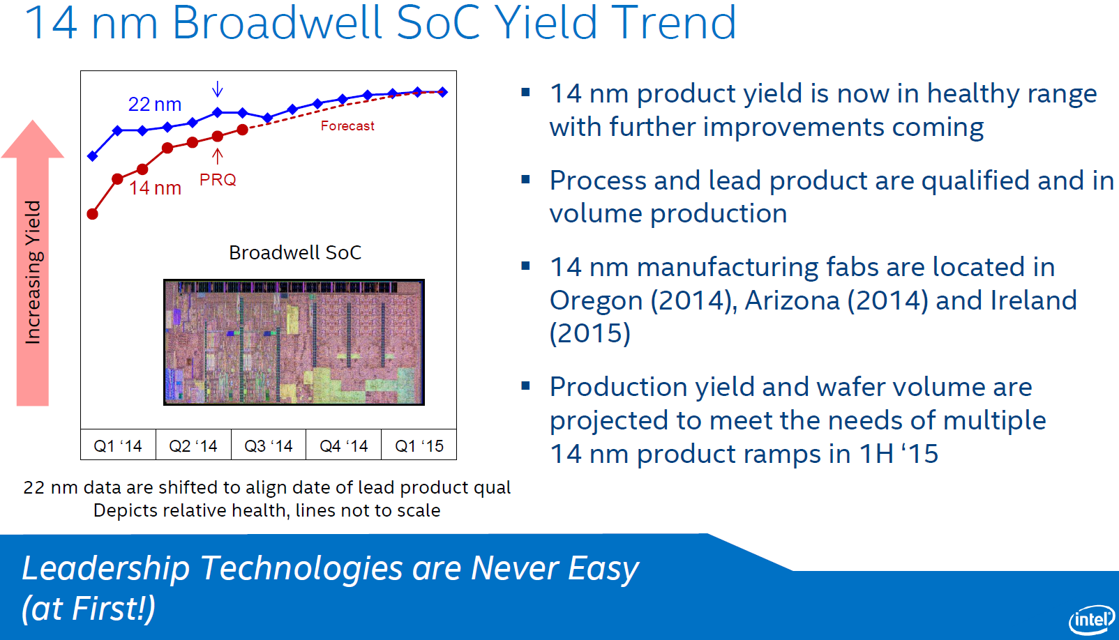 Although Intel Corp. has significantly improved yields of chips made using 14nm process technology, the company is still not completely satisfied with the result. Lower-than-expected yields have already caused Intel to postpone mass production of its code-named “Broadwell” microprocessors and will likely affect the company for several more months.