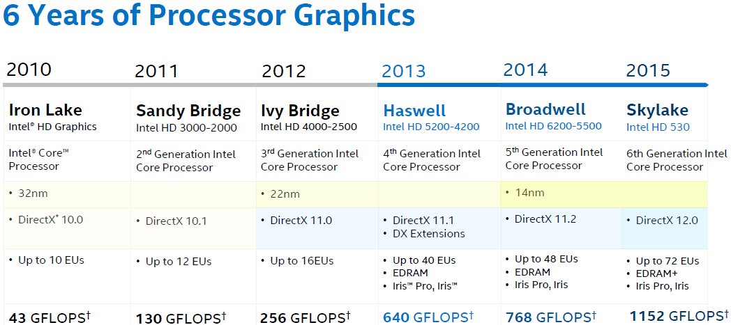 Intel’s upcoming “Skylake” processors will incorporate the company’s ninth generation graphics core (Gen 9) with improved internal architecture, increased number of execution units (EUs) and new eDRAM cache. Intel’s upcoming top-of-the-range integrated graphics processor – Iris Pro 500-series (GT4e) – will feature 72 EUs, eDRAM+ cache as well as 1152GFLOPS of FP32 compute performance, a 50 per cent improved over the highest-performing “Broadwell” IGP (GT3e, which features 48 EUs).