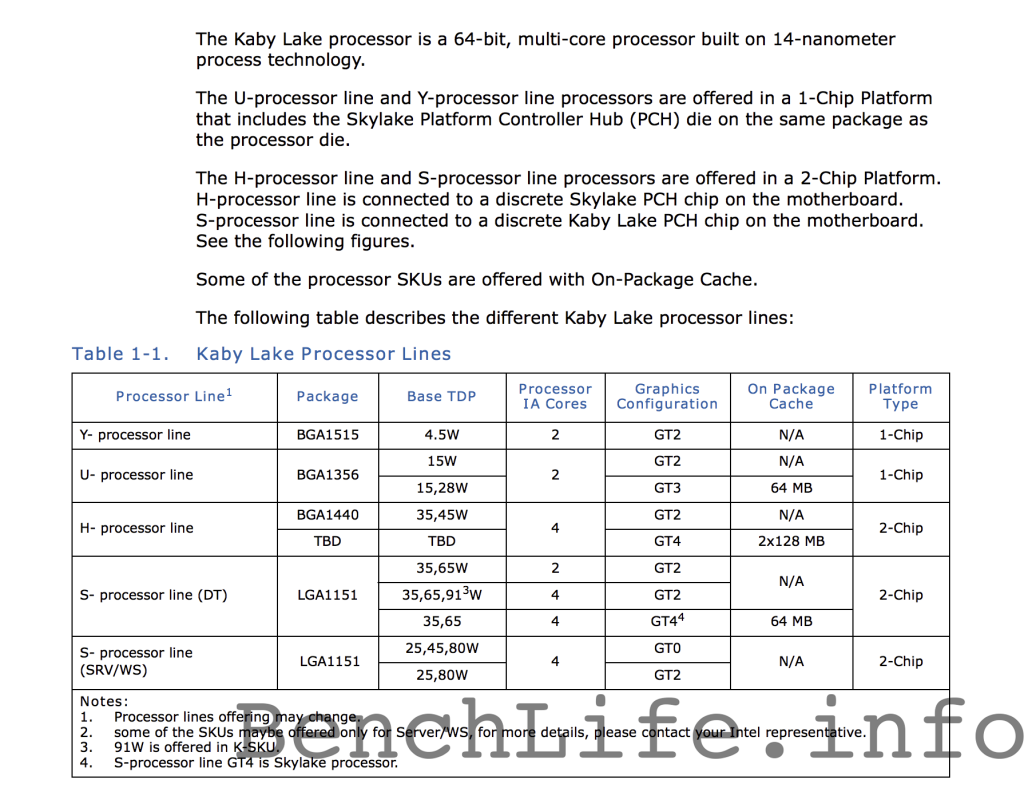 Intel’s “Kaby Lake” processors will feature two or four cores, a new generation integrated graphics engine, a dual-channel memory controller and up to 256MB of on-package cache to speed up graphics workloads. The new chips will address various segments of the market, including mobile and desktop clients, reports BenchLife. The chips will feature thermal design power starting at 4.5W and up to 91W.