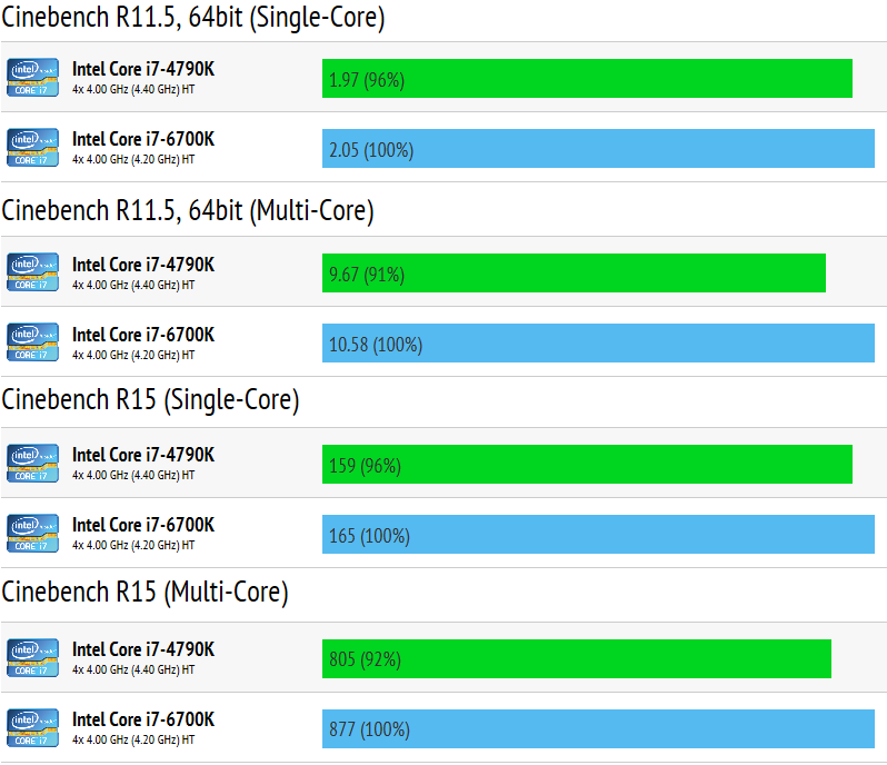 CPU-Monkey on Tuesday published a page with alleged Intel Core i7-4790K (four cores with Hyper-Threading, 4GHs/4.4GHz clock-rate, 8MB LLC, dual-channel DDR3 memory controller) vs. Intel Core i7-6700K (four cores with Hyper-Threading, 4GHs/4.2GHz clock-rate, 8MB LLC, dual-channel DDR4/DDR3L memory controller) benchmark results. The web-site did not reveal any details about test bed configurations, when the performance tests were made and by whom. One of the possible sources of the benchmark results are Intel’s own documents for partners, another imaginable source is an Intel partner with access to the new hardware.
